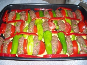 Yağlanmış fırın tepsisine sırasıyla bir köfte, bir patates, bir biber, bir domates olacak şekilde sıralayın.