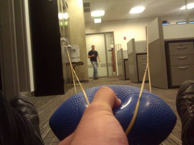 Beyzbol topu kullanarak sapan yapan ve sapanı arkadaşına doğrultan genç