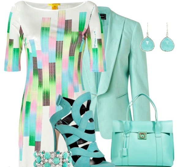 turkuaz beyaz elbise ceket ayakkabı ve çanta kombini